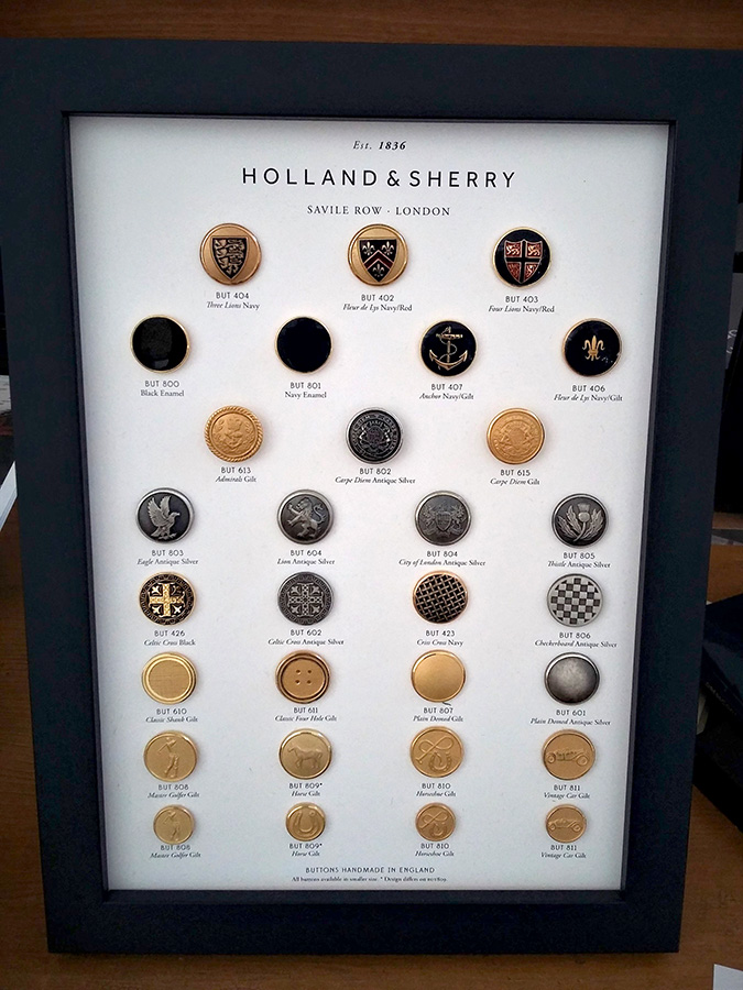 Wählen Sie aus meinen unzähligen Mustern edelster Stoffhändler, wie z.B. Scabal und Holland & Sherry. Ebenso reichhaltig ist mein Futterangebot mit noch echten Knöpfen aus Büffelhorn, Perlmutt, Steinnuss und Silber- und Gold.